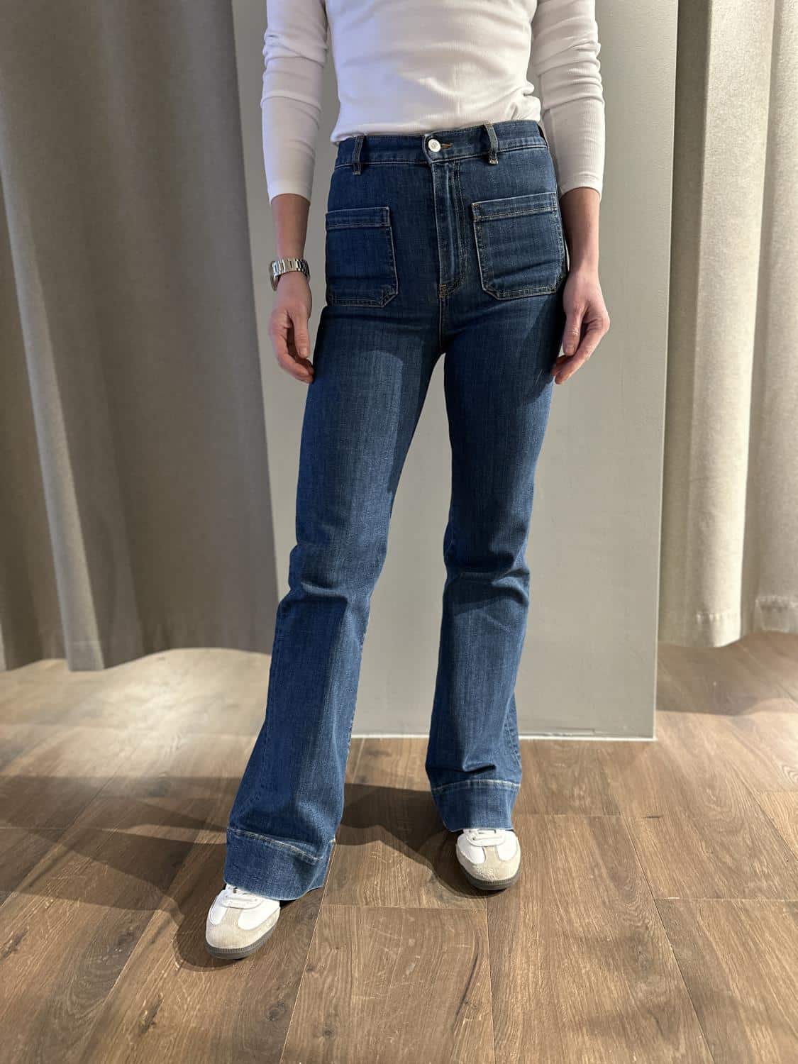 Er inspirert av seilerstilen med lommer foran og bak, sleng og bred kantlinje. Jeansen har knapp- og glidelåslukking med høyt liv og lang, flatterende beinlengde. Laget i organisk denim med svakt bleknet blåfarge.